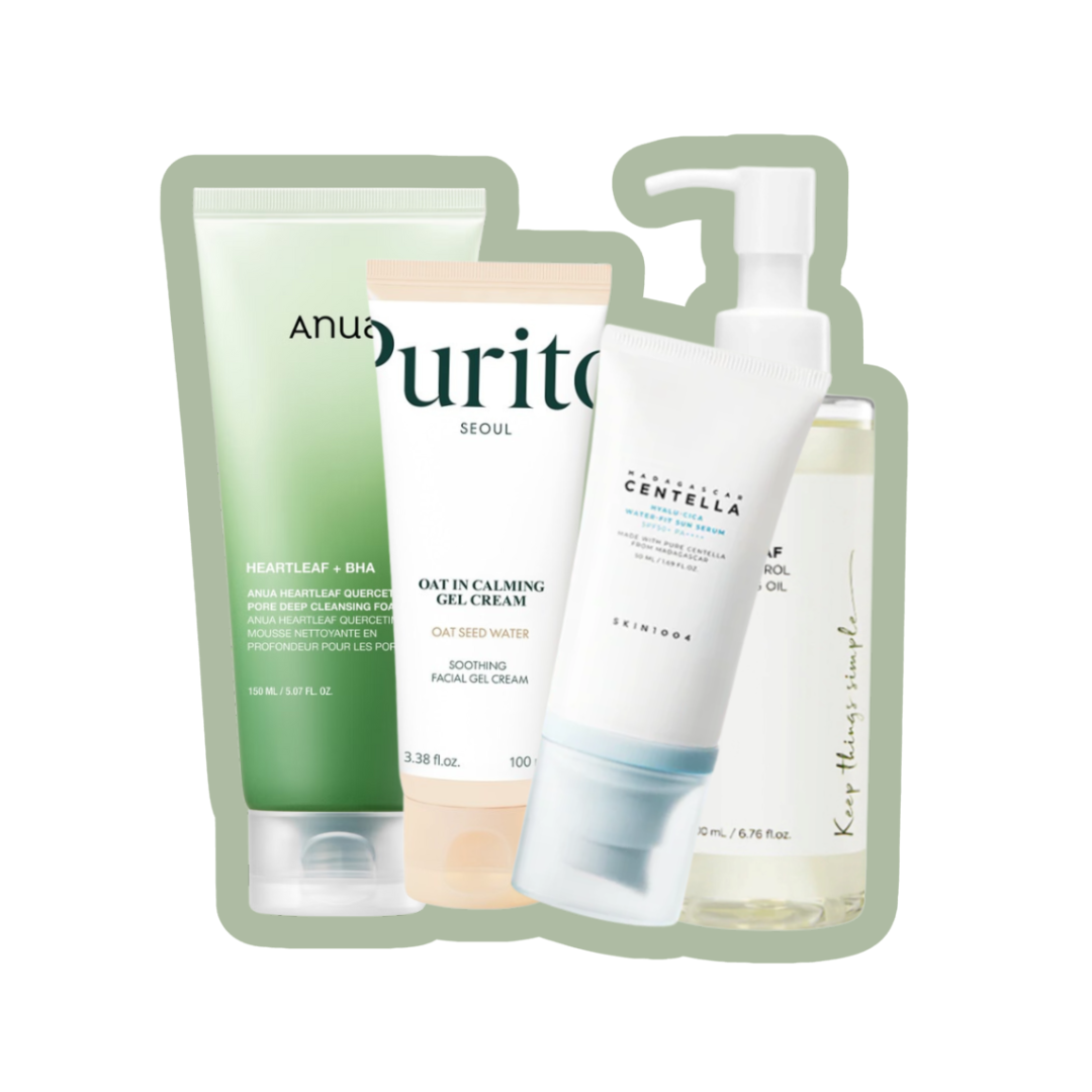 Gi huden en balansert og pleiende rutine med Anua Heartleaf Pore Control Cleansing Oil 200 ml, Anua Heartleaf Quercetinol Pore Deep Cleansing Foam 150 ml, SKIN1004 Hyalu-Cica Water-Fit Sun Serum SPF50+ PA++++ 50 ml, og Purito SEOUL Oat-in Calming Gel Cream 100 ml. Denne rutinen passer perfekt for fet og uren hud som ønsker å kontrollere talgproduksjon, redusere blankhet og opprettholde hudens naturlige balanse.