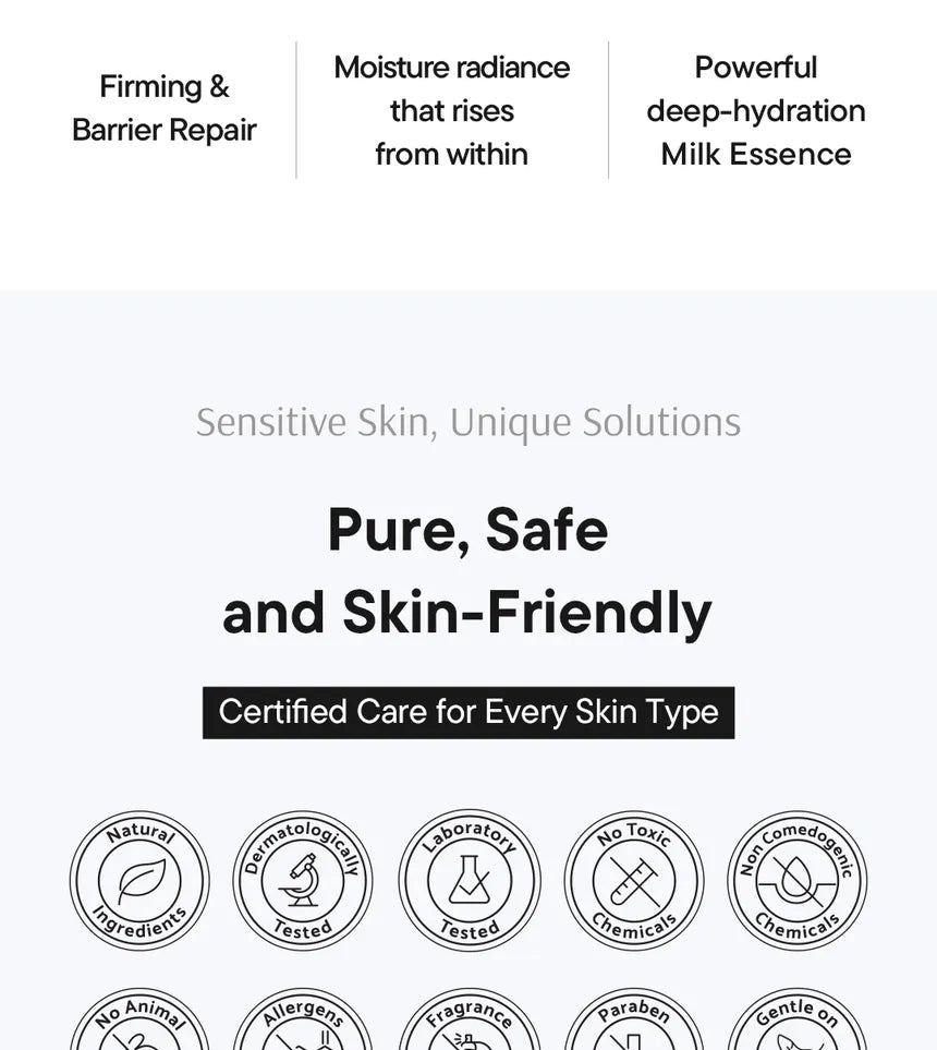iUNIK Beta-Glucan Lacto Barrier Milk Essence er en multifunksjonell essens som kombinerer fordelene fra både toner og serum i ett enkelt steg. Den silkemyke melkekonsistensen smelter raskt inn i huden og gir umiddelbar fukt uten å føles tung, noe som gjør den ideell for daglig bruk året rundt. Med et høyt innhold av fermenterte ingredienser bidrar essensen til å støtte hudens naturlige balanse og gi et mer spenstig uttrykk.