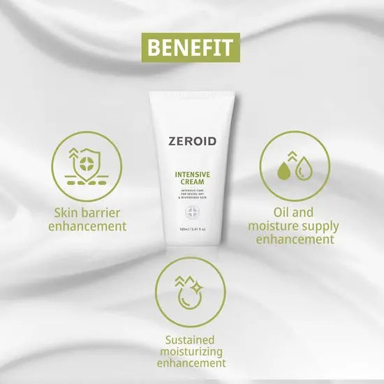 ZEROID Intensive Cream er helt fri for parfyme, parabener og mineraloljer, noe som gjør den trygg selv for de mest sensitive hudtypene. Resultatet er en sterkere, sunnere og mer motstandsdyktig hud som føles smidig, myk og balansert hver dag.